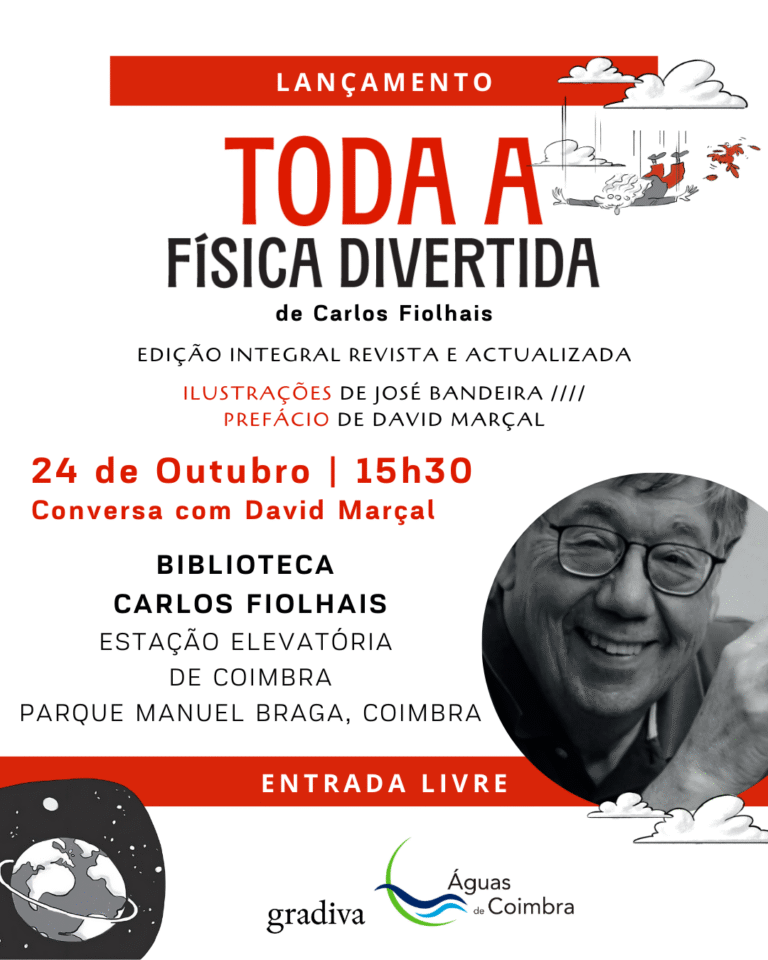 Esta quinta-feira, dia 24 de outubro, Carlos Fiolhais lança o seu mais recente livro – Toda a Física Divertida -, no espaço da Estação Elevatória de Coimbra – Biblioteca Carlos Fiolhais. A obra será apresentada numa sessão que está marcada para as 14h30, dirigida a alunos do 3.º ciclo, e prosseguirá, depois